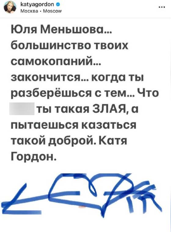 Примечательно, что вскоре Гордон удалила свой пост и призвала подписчиков никогда не относиться серьезно ко всему, что происходит в публичном пространстве. При этом Екатерина заявила, что ее «задолбало милое хамское отношение» к ней Меньшовой.