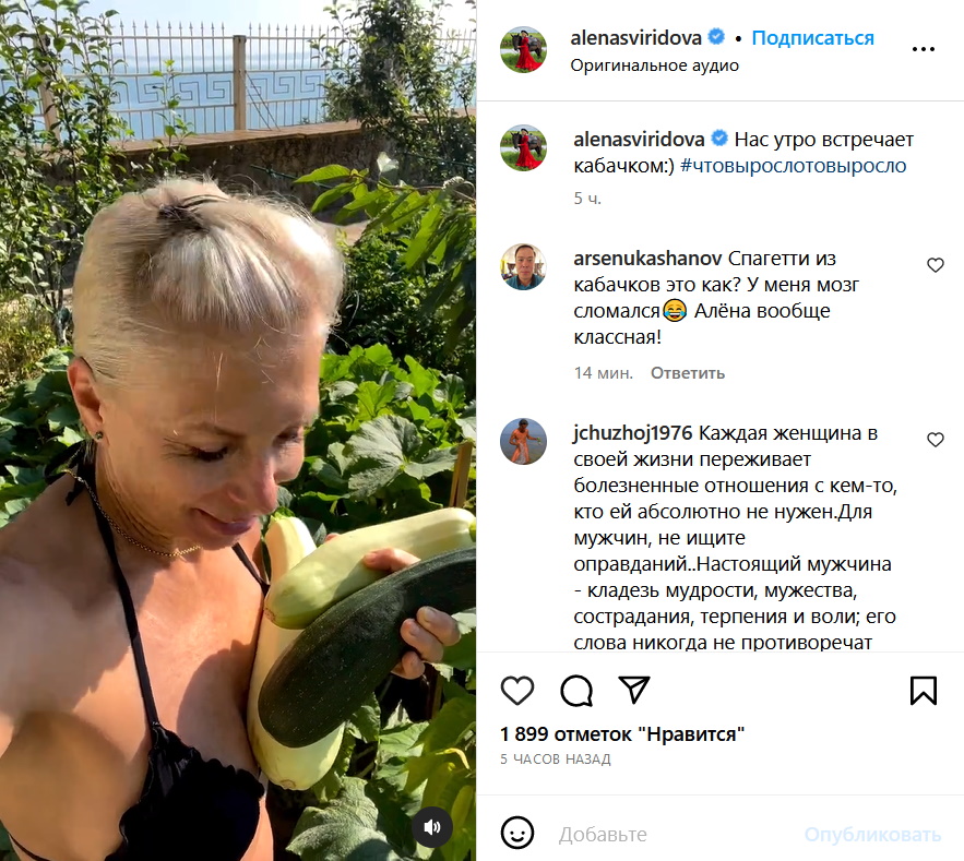 В начале мая обаятельная певица отправилась в небольшое путешествие по Европе, где с помощью взрослого сына умудрилась обмануть систему. О своей маленькой хитрости Алена Свиридова тут же поспешила рассказать в деталях, попутно вспомнив о лихих 90-х и сушке волос перед раскаленной духовкой. Вернувшись домой, блондинка продолжила заниматься интимным хобби. Выращивание овощей для артистки уже давно является не только полезным увлечением. Физические нагрузки и приятная усталость от возни на грядках позволяют ей отвлечься от повседневных забот и стрессов.