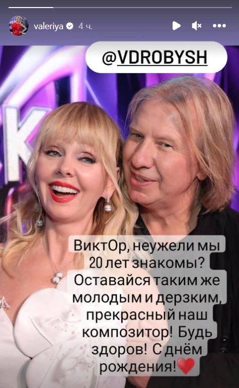 В личном микроблоге исполнительница обратилась к композитору Виктору Дробышу. Она поздравила музыкального продюсера с днем рождения: 27 июня ему исполнилось 57 лет. Валерия опубликовала фото с давним приятелем, на котором просто светится от счастья.