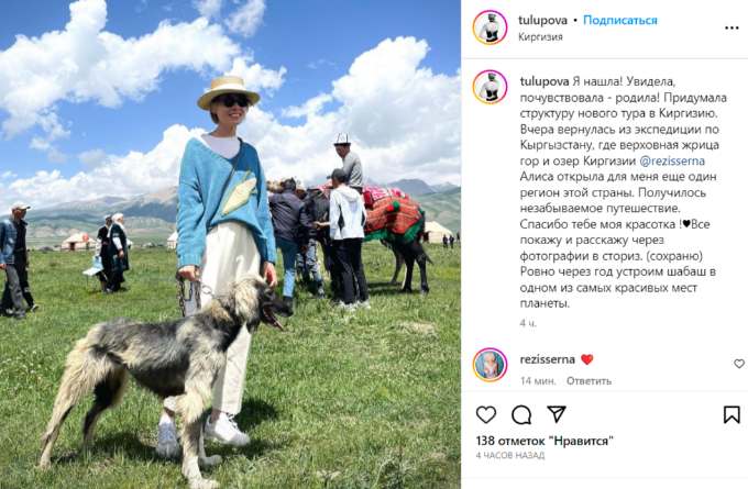 «Я нашла! Увидела, почувствовала — родила! Придумала структуру нового тура в Киргизию. Вчера вернулась из экспедиции по Кыргызстану, где верховная жрица гор и озер Киргизии Алиса открыла для меня еще один регион этой страны. Получилось незабываемое путешествие. Спасибо тебе моя красотка! Все покажу и расскажу через фотографии в сториз. Ровно через год устроим шабаш в одном из самых красивых мест планеты», — пообещала подписчикам возлюбленная Дмитрия Шепелева.