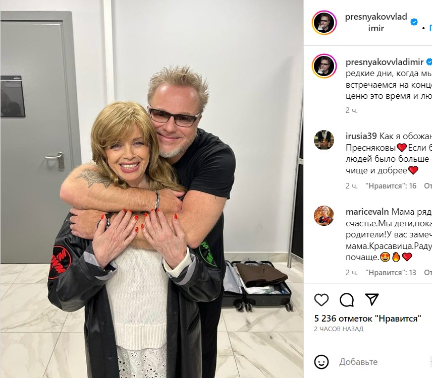 Фото растрогало подписчиков певца. Они осыпали комплиментами солистку «Самоцветов» и отметили, что Пресняков вырос прекрасным сыном, который не концентрируется на детских обидах, даже если они и были.