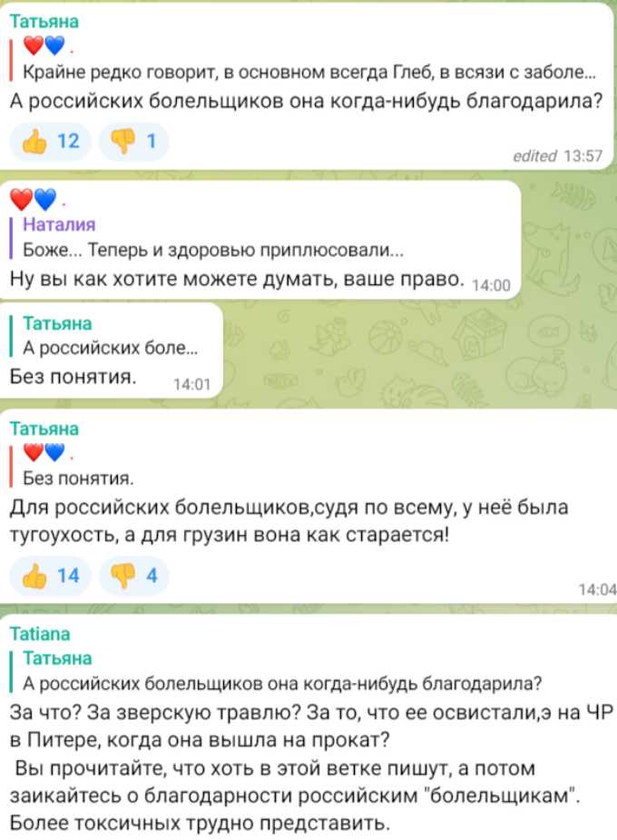 «Бамбарбия кер гуду...»; «А российских болельщиков она когда-нибудь благодарила?»; «Для российских болельщиков, судя по всему, у нее была тугоухость, а для грузин вона как старается!» — эти и другие сообщения можно было прочитать в Telegram-канале «Тулуп Тутберидзе» после обращения Дианы на грузинском языке.