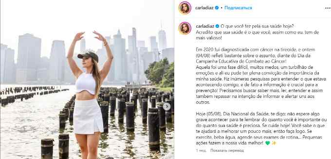 «Это был сложный этап, много страхов, вихрь эмоций и там я полностью убедился в важности своего здоровья. Я провел бесчисленное количество исследований, чтобы понять, что со мной происходит, и действительно информация имеет решающее значение для профилактики! Нужно стремиться знать больше, читать, понимать и тем самым пересмотреть намерение информировать друг друга и предупреждать», — писала Карла в Instagram*.