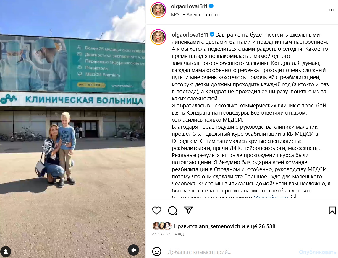 «Я думаю, каждая мама особенного ребенка проходит очень сложный путь, и мне очень захотелось помочь ей с реабилитацией, которую детки должны проходить каждый год (а кто-то и раз в полгода), а Кондрат не проходил ее ни разу, понятно из-за каких сложностей.Я обратилась в несколько коммерческих клиник с просьбой взять Кондрата на процедуры. Все ответили отказом, согласились только Медси», — написала певица на своей официальной странице в «Инстаграме*».