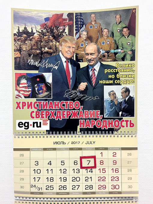 Коган был нужен мне как член Совета по международным отношениям США. Он обещал воспользоваться служебным положением и передать Дональду Трампу настенный календарь от EG.RU. Там Трамп изображен рядом с Владимиром Путиным и начертаны пророческие слова «Христианство, сверхдержавие, народность». По моим расчетам, получив его в руки, Трамп должен был понять повестку встречи с нашим президентом в Гамбурге.
