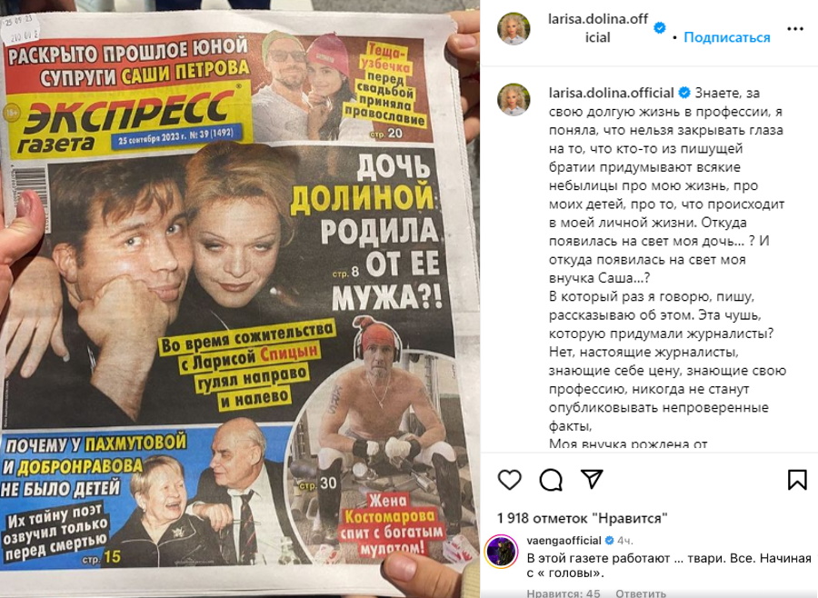 Именно в тот момент в гости на официальную страницу Долиной в «Инстаграме*» и пожаловала брюнетка. В отличие от коллеги по цеху, Ваенга не стала церемониться с «обидчиками» приятельницы, буквально взорвавшись у всех на глазах. Комментируя пост певицы и педагога по вокалу, лауреат премий «Шансон года» и внучка контр-адмирала Василия Журавеля в одном лице не постеснялась оскорбить неугодных ей акул пера.