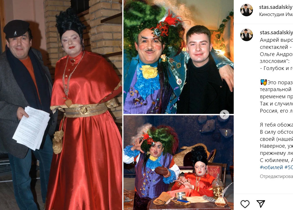 К поздравлению актер приложил несколько совместных фото из личного архива. На снимках Садальский и Данилко позируют вместе в театральных костюмах.