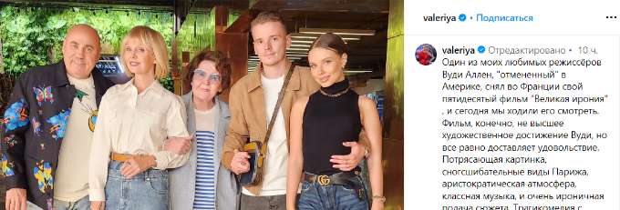«Один из моих любимых режиссеров Вуди Аллен, «отмененный» в Америке, снял во Франции свой пятидесятый фильм «Великая ирония», и сегодня мы ходили его смотреть. Фильм, конечно, не высшее художественное достижение Вуди, но все равно доставляет удовольствие. Потрясающая картинка, сногсшибательные виды Парижа, аристократическая атмосфера, классная музыка и очень ироничная подача сюжета. Трагикомедия с привкусом триллера — Вуди Аллен в своей привычной, узнаваемой манере повествования. Вот нравятся мне его фильмы, и все тут», — поделилась впечатлениями артистка.