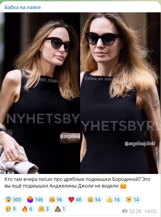 «У меня такая же подмыха-писька», «Ах, Лара Крофт...а ты была так горяча...», «Анджелина для своих лет выглядит просто фантастически! И естественно. Было бы хуже наблюдать штопанные подмышки», «Все здоровье на войну с Брэдушкой потратила, которую сама же и начала», «Поэтому возрастным женщинам не рекомендуются короткие рукава», «Я понимаю, когда молодых за неухоженность обсуждают, но когда женщине за 40, это уже дурной тон, все мы разные, кожа у всех разная», — рассуждают поклонники Анджелины Джоли.