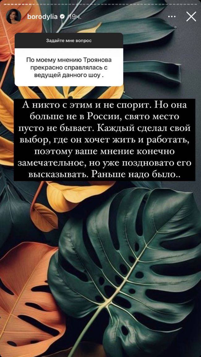 В своих социальных сетях Ксения решила жестко ответить завистникам и высказала все, что думает о бежавшей из России Трояновой. Отвечая на вопросы подписчиков, Бородина отметила, что в таланте своей предшественницы нисколько не сомневается, однако свой шанс та уже упустила, а свято место, как известно, пусто не бывает.