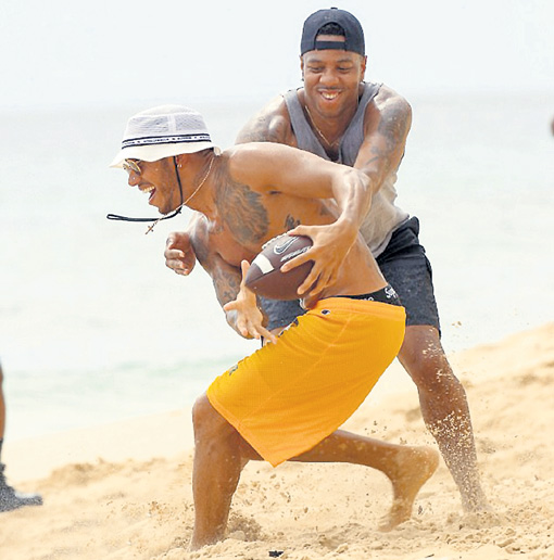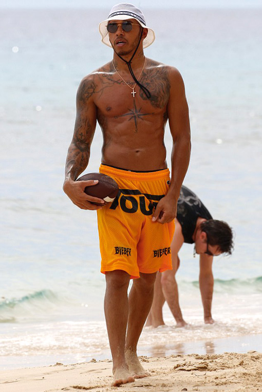 В перерыве между стартами трехкратный чемпион «Формулы-1» Льюис Хэмилтон нашел время расслабиться на Барбадосе. 32-летний автогонщик дружит с поп-звездой Джастином Бибером и на пляж вырядился в шорты с надписью в поддержку тура певца Purpose. Спортсмен - всегда спортсмен. При отсутствии гоночного болида Хэмилтон нашел другие виды физической нагрузки - плавание и регби.