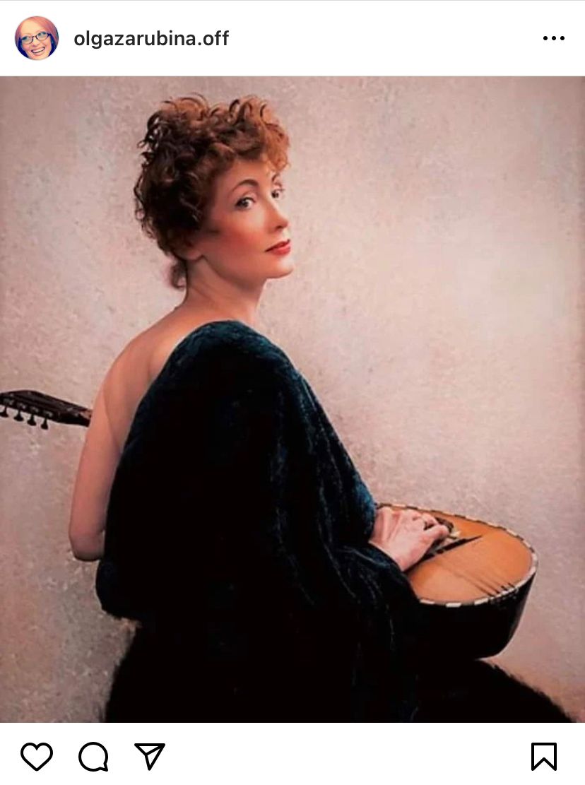 На опубликованном кадре, который, как полагают некоторые комментаторы, оказался творением нейросети, Зарубина в образе нимфы с высокой прической позирует в спадающем с плеч наряде, а в руках держит музыкальный инструмент.