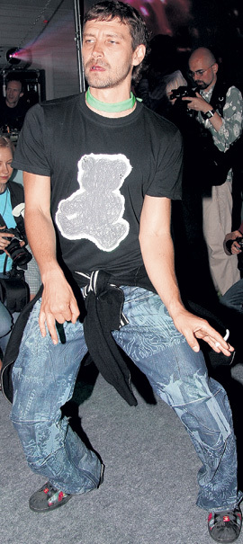 Стилист: Громоздкий принт из страз добавляет стройным ногам Оксаны лишний объем. Здесь бы отлично смотрелись зауженные джинсы с леопардовым или змеиным окрасом. Баскову стоило выбрать темно-синий цвет - голубые джинсы, да еще и с потертостями визуально утолщают ногу.