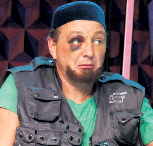 Быстренько читаю описание спектакля. Башаров играет любителя выпить, но не бомжа же из подворотни с побитым лицом?! А может, это задумка режиссера Владимира Устюгова? Ведь заставил же он надеть женское платье Филиппа Васильева. А его знаменитой маме велел нанести яркий грим, нацепил на нее парик и накладную грудь пятого размера. Но, внимательно разглядывая Башарова, четко понимаю, что его «фонарь» - не проделки гримеров, а самый что ни на есть настоящий синяк.