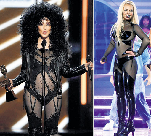 71-летняя Шер в таком виде вышла на сцену на церемонии Billboard Music Awards. А Бритни Спирс двумя годами ранее выступила в этом прикиде на той же премии. Для сценического наряда и то, и другое допустимо. Для других случаев - нет. Пожилая Шер похожа на хозяйку придорожного борделя, а Брит - на дешевую проститутку.