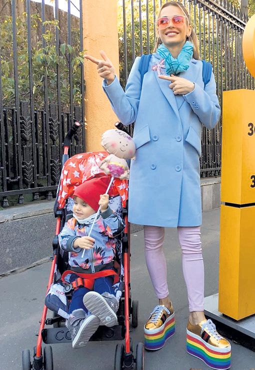 Стилист: Голубой очень идет блондинкам. Но эта преувеличенная мультяшность… Она, наверное, отлично подошла бы девочке лет 15, а на взрослой женщине, маме, хотелось бы видеть как минимум другую обувь. Например высокие кеды.