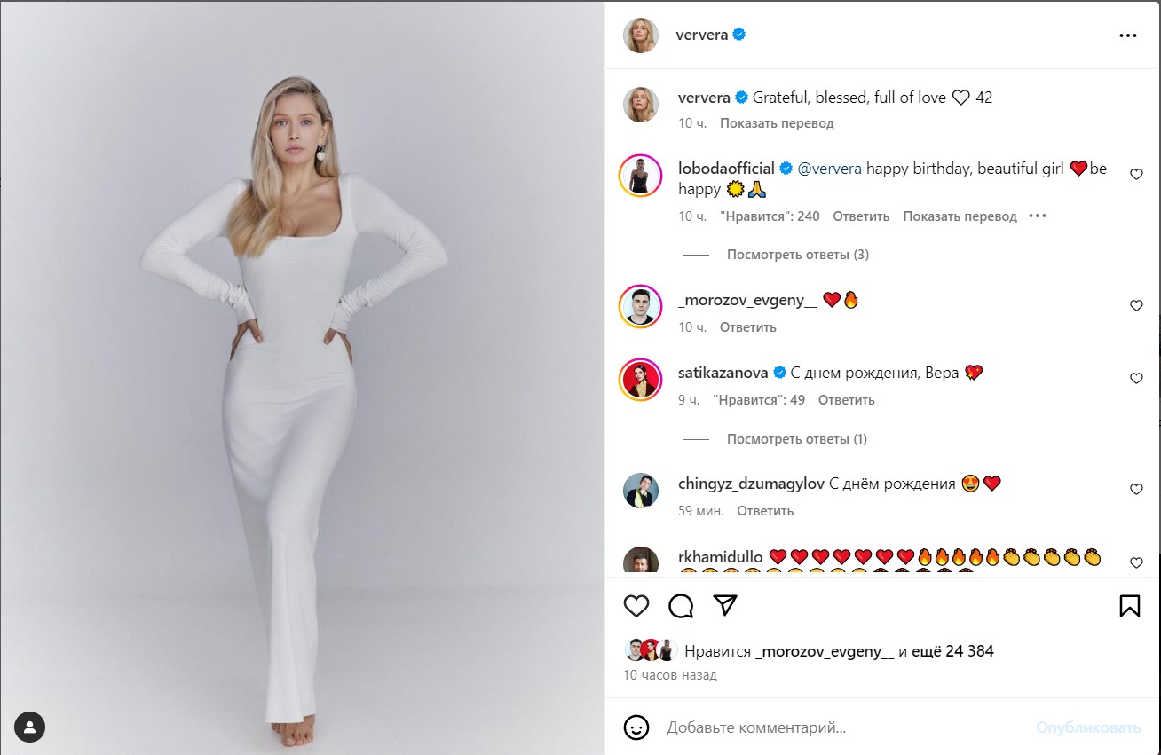 Одной из первых экс-супругу Константина Меладзе поздравила коллега по цеху Светлана Лобода. Пышногрудая украинка оставила в комментариях пожелание на английском языке: «С днем рождения, прекрасная девочка. Будь счастлива». Судя по всему, Вера и Света в Европе забыли и русский, и украинский.