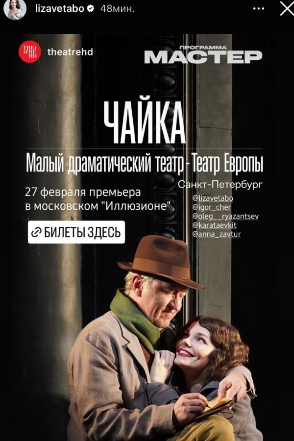 38-летняя Елизавета Боярская является одной из самых востребованных и популярных отечественных актрис. Наследница главного мушкетера страны активно снимается в кино и регулярно появляется на сцене Малого драматического театра Санкт-Петербурга, также известного как Театр Европы. В своем аккаунте на запрещенной в России платформе Instagram* красотка анонсировала кинопремьеру спектакля «Чайка», который до этого был представлен на сцене культурного учреждения. Постановку режиссера Льва Додина считают новаторской.