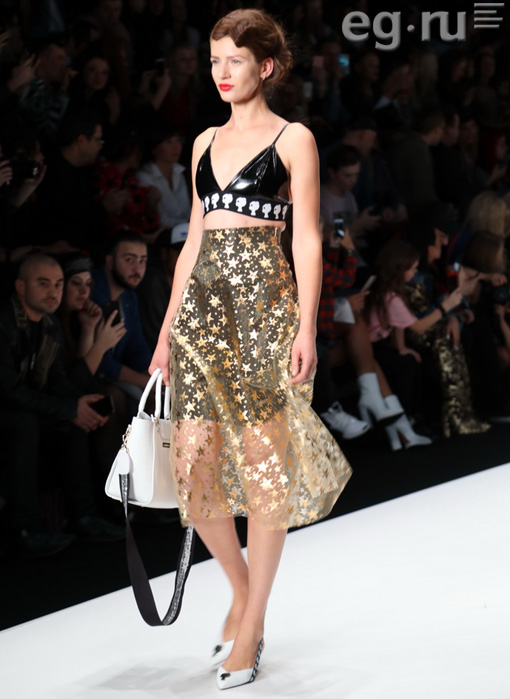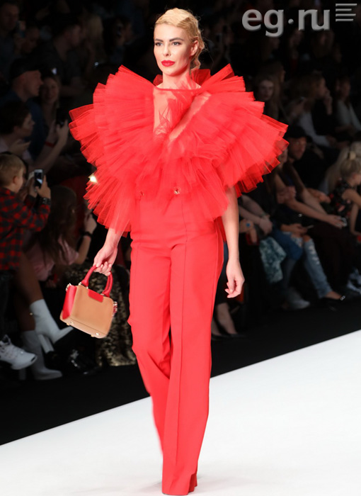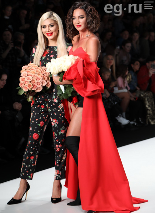 В дефиле приняла участие и телеведущая, а с недавних пор и певица Ольга Бузова, вышедшая на подиум в прозрачном платье в золотую полоску от Беллы Потемкиной. Также Бузова показала облегающее платье с аппликацией и ярко-красный комплект с отрезными рукавами и юбкой с запахом, сочетавшийся с черными сапогами-чулками и шортами того же цвета. Бузова исполнила несколько песен, впрочем, и сам показ проходил под микс из ее композиций. В новой коллекции доминируют бархат, звездные и цветочные принты, укороченные сапоги-чулки и ярко-красный цвет. Декоративный элемент большинства моделей - сетка. Она используется для отделки на подоле платьев или в качестве объемной аппликаций на плечах.