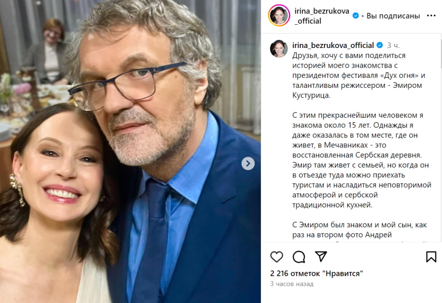 «Однажды я даже оказалась в том месте, где он живет, в Мечавниках - это восстановленная сербская деревня. Эмир там живет с семьей, но когда он в отъезде, туда можно приехать туристам и насладиться неповторимой атмосферой и сербской традиционной кухней. С Эмиром был знаком и мой сын… Мы с Эмиром часто встречаемся на Московском кинофестивале, он никогда не проходит мимо, всегда вежливо здоровается. И вот в этот раз на фестивале, где я была ведущей церемоний открытия и закрытия фестиваля «Дух огня», нам удалось несколько раз мило пообщаться», — поделилась приятными впечатлениями с подписчиками Безрукова.