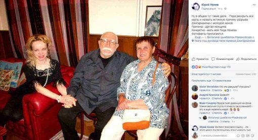 Так, журналист и артист Юрий Ненев опубликовал в фейсбук** ироничный пост, который потом перепостила у себя на странице Виталина. Мужчина разместил фотографию Армена Борисовича, Цымбалюк-Романовской и некой женщины, а в подписи отметил, что готов назвать «истинную причину» развода актера. Юрий сообщил, что всему виной стала «другая женщина», а именно его мать Лидия, и в доказательство он прилагает снимок, на котором актер обнимает немолодую даму.