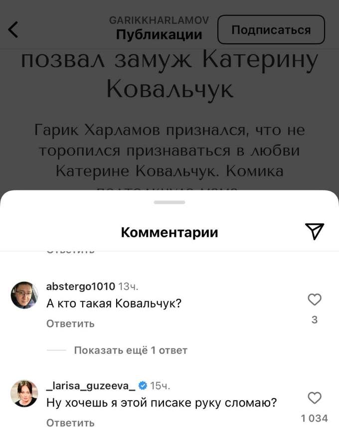 Аналогичное сообщение Гарик разместил и в запрещенном Instagram*, где ему тут же принялись сочувствовать коллеги по шоу-бизнесу и поклонники. Правда, кое-кто и посмеялся то ли над Харламовым, то ли вместе с Харламовым. «Если давление матери 120/80 – то норма», — заявила юмористка Екатерина Скулкина. Но заметнее всех оказался комментарий Ларисы Гузеевой.