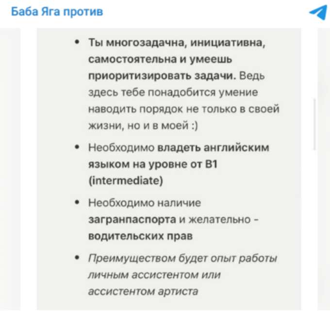 «Привет! Я Ира Горбачева — актриса, певица и блогер, и у меня есть сууупер-новость: задач в моих проектах становится все больше, а это значит, что открывается прекрасная возможность — стать частью моей команды!» — с таких приветственных слов начинается вакансия на личного помощника звезды «Чик» и «Бременских музыкантов». Поначалу в объявлении все выглядит неплохо. Однако чем дальше идешь по списку будущих обязанностей «правой руки» Ирины, тем больше вопросов к зарплате, которую она указала в конце объявления.