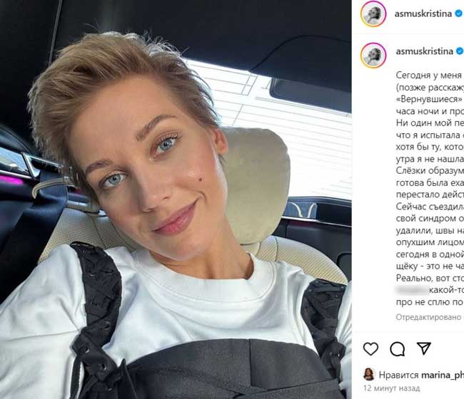Меж тем у актрисы случилась беда. О произошедшем Кристина рассказала на своей официальной страничке в запрещенной социальной сети «Инстаграм*». Она опубликовала свою свежую фотографию и пожаловалась, что не успела она рассказать о том, как все удачно складывается в ее жизни, как случилось несчастье.