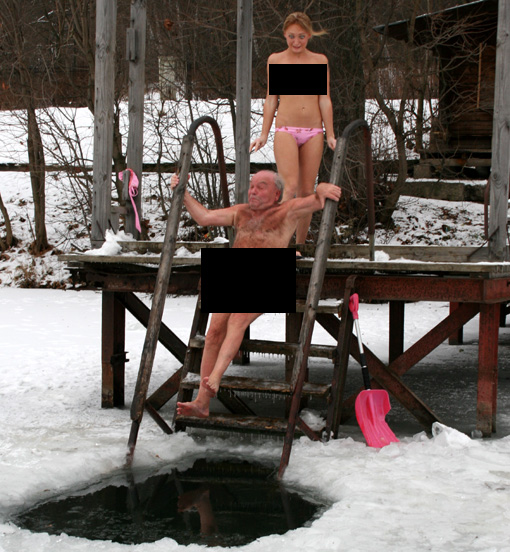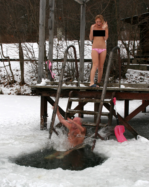 Момент падения, что называется, на автомате сфотографировал фотограф. Который, так же, как и я остолбенел, от ужаса. Но оцепенение длилось несколько секунд. Я бросился спасать музыкальную гордость страны, однако оказалось, что края проруби острые и царапали беззащитный живот классика. С большим трудом удалось вытащить его на поверхность так, чтобы не нанести серьезную травму.