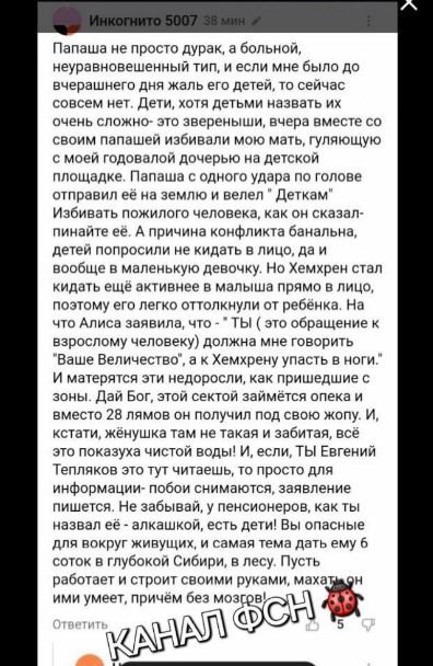 Возмущенная поведением мужчины соседка также посоветовала властям отправить Тепляковых куда-нибудь в Сибирь, где у Евгения бы наконец-то появилась возможность применить силу по назначению: «Пусть работает и строит своими руками, махать он ими умеет, причем без мозгов». Само собой, что на главу семейства уже написали заявление в полицию, которое было принято вместе со справкой из травмпункта (сотрясение мозга, закрытая черепно-мозговая травма, ушиб колена, ушибы и ссадины).