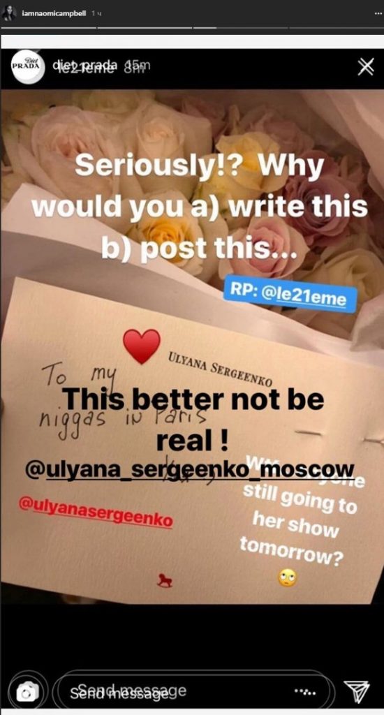 Пост Мирославы попался на глаза прославленной супермодели Наоми Кэмпбелл, которая не увидела в написанной Ульяной фразе ничего смешного, ведь слово niggas является оскорбительным для всех афроамериканцев. Более того, темнокожая манекенщица не преминула опубликовать столь возмутивший ее снимок в Stories, сопроводив его призывом к подписчикам бойкотировать показ Ульяны Сергеенко из-за ее расистского высказывания. «Серьезно??? Зачем вы а) написали это; б) опубликовали это... Лучше бы это не было правдой! Вы все еще собираетесь на ее шоу завтра?» — заявила Кэмпбелл.