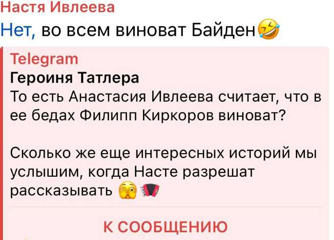 Киркоров пока молчит и шумиху вокруг своих слов не комментирует. А вот Ивлеева, напавшая на Филиппа, продолжает публиковать мемы в личном блоге в ответ на рассуждения каналов телеграм по поводу нового скандала вокруг «голой» вечеринки.