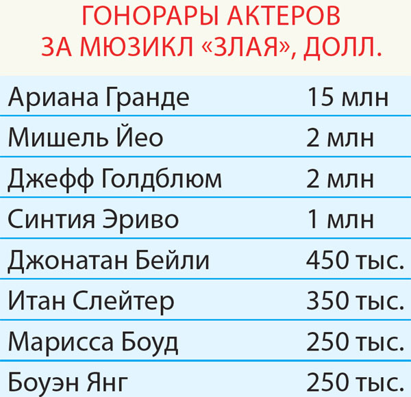 По неофициальным данным, гонорар Гранде за роль доброй ведьмы Глинды составил $15 млн (см. табл.). При этом Синтия Эриво за роль злой ведьмы Эльфабы получила всего $1 млн, притом что зеленый грим ей накладывали по четыре часа в день.