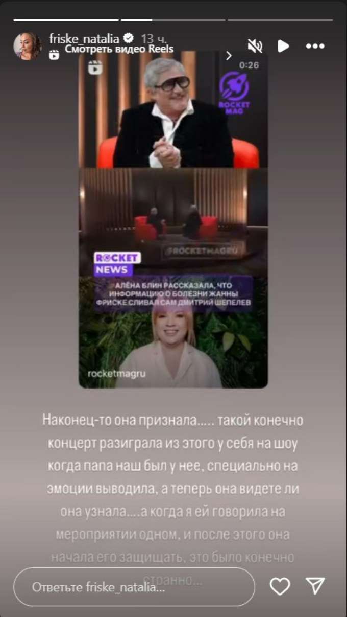 «Наконец-то она признала. Такой, конечно, концерт разыграла из этого у себя на шоу, когда папа наш был у нее, специально на эмоции выводила, а теперь, видите ли, она узнала... А, когда я ей говорила на мероприятии одном, и после этого она начала его защищать, это было, конечно, странно», — рассказала Наталья Фриске.