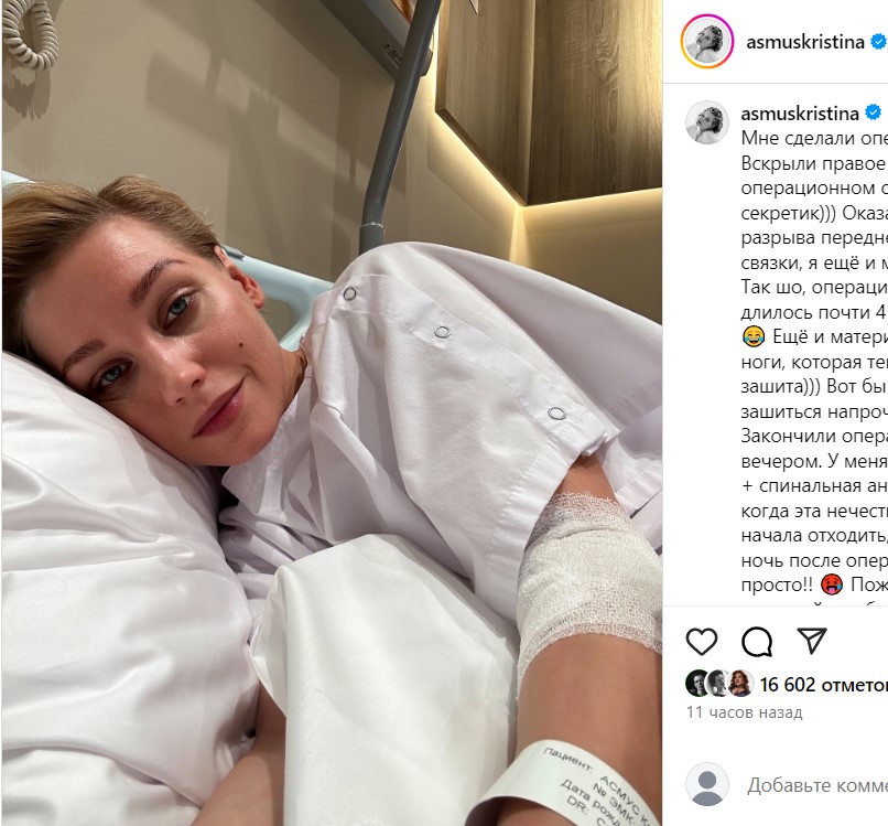 «Оказалось, что помимо разрыва передней крестообразной связки, я еще и мениск порвала. Так шо, операционное действо длилось почти 4 часа без антракта. Еще и материал брали из второй ноги, которая теперь тоже болит и зашита. […] У меня был общий наркоз + спинальная анестезия. И вот когда эта нечестивая спинальная начала отходить, а следом и первая ночь после операции — ну, это адище просто!» — поделилась артистка.