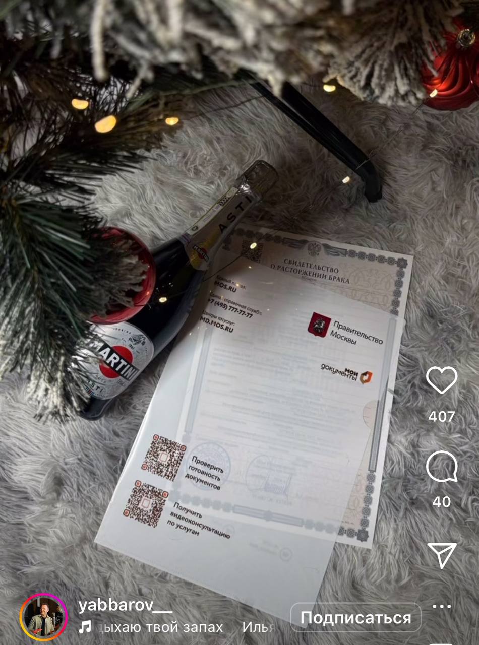 Яббаров опубликовал у себя в блоге фотографию свидетельства о расторжении брака и коротко написал: