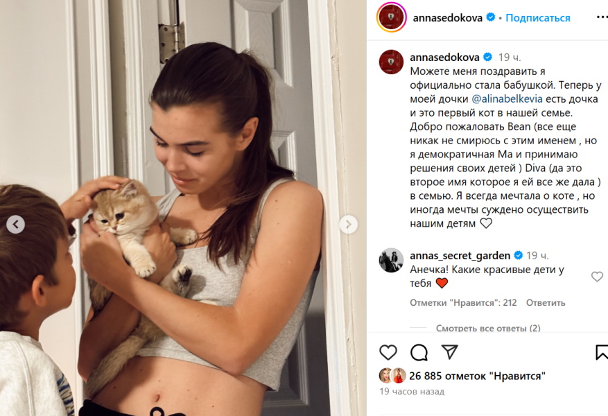 «Можете меня поздравить, я официально стала бабушкой. Теперь у моей дочки Алины есть дочка, и это первый кот в нашей семье. У меня есть котовнучка! Добро пожаловать, Бин (я все еще не смирилась с этим именем, но я демократичная мама и принимаю решения своих детей) Дива (да, это второе имя, которое я ей все же дала) в нашу семью. Я всегда мечтала о коте, но иногда мечты сбываются благодаря нашим детям», - написала артистка в своей свежей публикации.