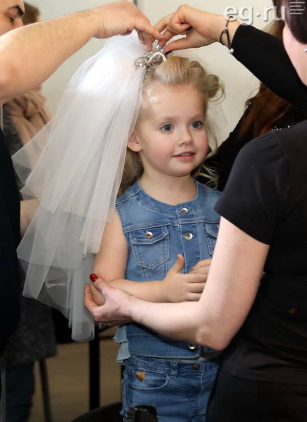 Четырехлетняя Лиза Галкина вышла на подиум в образе невесты — в белоснежном платье и фате. Модные стилисты сделали дочке Примадонны стильную укладку, завив белокурые локоны юной модели. В руках маленькая Лиза держала букетик.