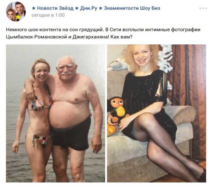 Многие интернет-пользователи восхитились искренностью фотографии, однако нашлось место и для скабрезных комментариев вроде «Морж и головастик», которые намекают на значительную разницу в телосложении Джигарханяна и Цымбалюк-Романовской, пишут .