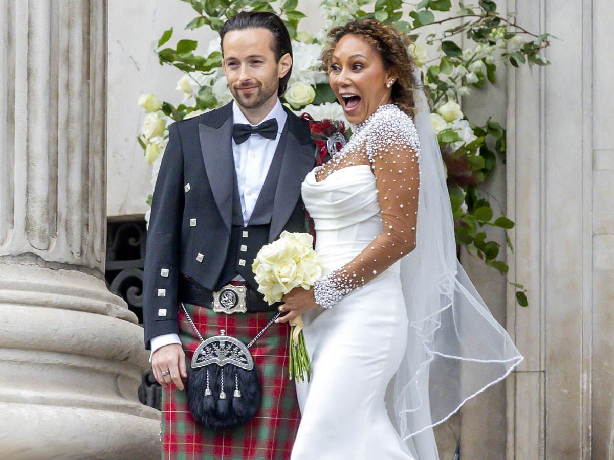 Венчание пара устроила в главном соборе Лондона - Святого Павла. Из селебрити лично поздравили новобрачных супермодель и актриса Кара Делевинь и подружка Мел по Spice Girls Эмма Бантон. Три другие партнерши - Виктория Бекхэм, Джерри Халливелл и Мел Си (Мелани Чисхольм) - были заняты на работе и приехать не смогли.