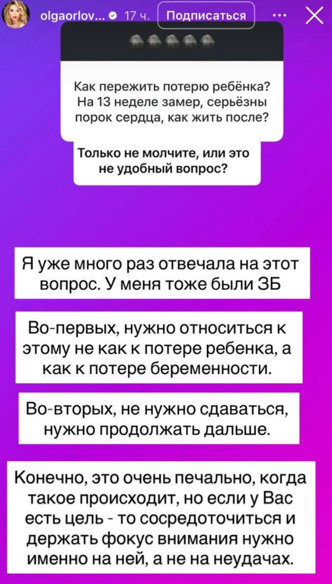 К примеру, недавно одна из пользовательниц Сети обратилась к звезде с душераздирающим вопросом. «Как пережить потерю ребенка? На 13 неделе замер, серьезный порок сердца, как жить после?» — такое сообщение получила Ольга. Орлова постаралась как можно более спокойно ответить подписчице, рассказав ей о своей замершей беременности. Подбирая нужные слова для безутешной женщины, телеведущая предложила ей относиться к сложившейся ситуации не как к потере малыша.