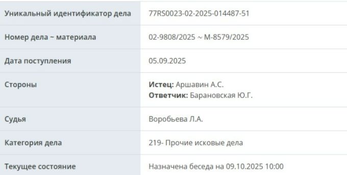 «В Савеловский районный суд города Москвы поступило исковое заявление Андрея Аршавина к Юлии Барановской об изменении размера алиментов. Подготовка дела к судебному разбирательству назначена на 9 октября 2025 года», — передает официальный телеграм-канал судов общей юрисдикции города Москвы.