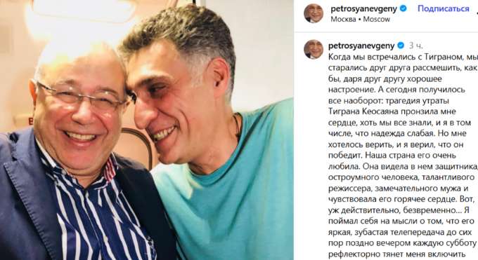 «Когда мы встречались с Тиграном, мы старались друг друга рассмешить, как бы, даря друг другу хорошее настроение. А сегодня получилось все наоборот: трагедия утраты Тиграна Кеосаяна пронзила мне сердце, хоть мы все знали, и я в том числе, что надежда слабая. Но мне хотелось верить, и я верил, что он победит. <…> Память о Тигране останется навсегда в моем сердце. Выражаю сердечное соболезнование многочисленной семье незабвенного Кеосаяна», — заключил Петросян.