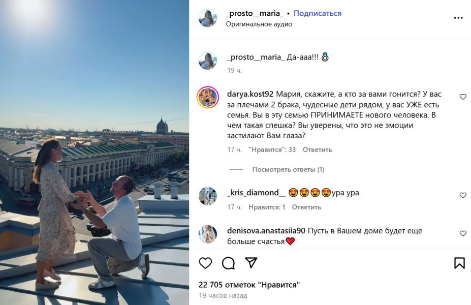 Будущий супруг осчастливил Марию, сделав ей романтическое предложение прямо на крыше в центре Санкт-Петербурга, откуда открываются шикарные виды на Гостиный двор и Казанский собор. При этом знакомство Круглихиной с Алексеем состоялось далеко не вчера. Как-то раз мужчина здорово выручил блогершу, когда ее автомобиль забуксовал в сугробе. Уходя, спаситель выдал фразу, которая сразу же запала в душу 40-летней красотки: