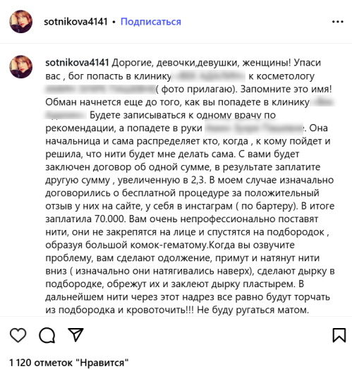 «Вам очень непрофессионально поставят нити, они не закрепятся на лице и спустятся на подбородок, образуя большой комок-гематому. Когда вы озвучите проблему, вам сделают одолжение, примут и натянут нити вниз (изначально они натягивались наверх), сделают дырку в подбородке, обрежут их и заклеят дырку пластырем. В дальнейшем нити через этот надрез все равно будут торчать из подбородка и кровоточить!!! Не буду ругаться матом», - написала актриса в личном микроблоге.