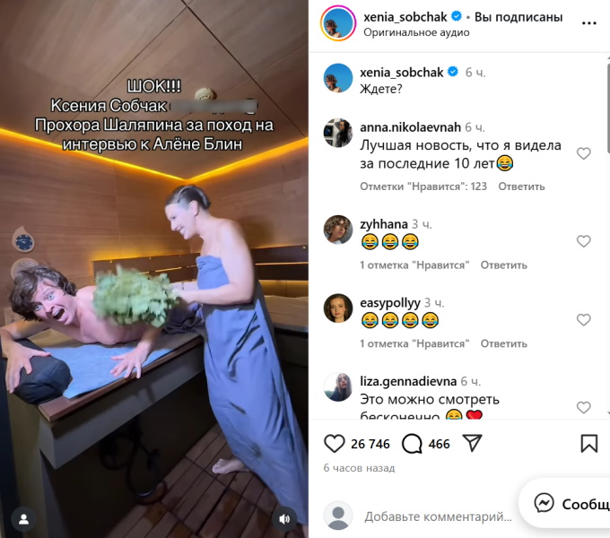«Шок!!! Ксения Собчак ***** Прохора Шаляпина за поход на интервью к Алене Блин», - пошутила журналистка.