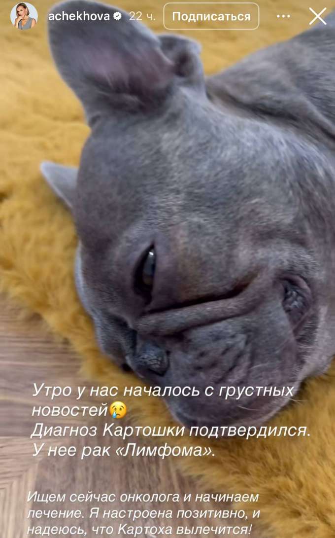 «Утро у нас началось с грустных новостей. Диагноз Картошки подтвердился. У нее рак «Лимфома». Ищем сейчас онколога и начинаем лечение», — рассказала Чехова.