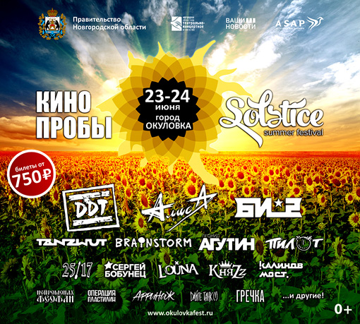 Хедлайнерами фестиваля станут наиболее востребованные отечественные музыканты. Они выступят с полноценными концертными программами. Так, группа ДДТ откроет фестиваль в ночь с пятницы на субботу программой «История Звука», субботний день завершится шоу в честь 35-летнего юбилея группы Алиса, а сам фестиваль будет закрыт в воскресенье 24 июня группой Би-2 программой «Горизонт Событий».