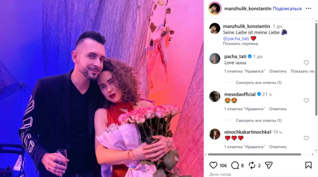 Нешуточный интерес вызвало фото, которое пользователи уже позже обнаружили в соцстеях музыкального блогера Константина Манжулы. Молодой человек разместил совместный снимок с дочерью Любови Успенской. Парочка нежно обнималась, а в руках Татьяны красовался роскошный букет из роз. Судя, по всему, цветы автору выставки “MON AIR” преподнес именно внимательный спутник.