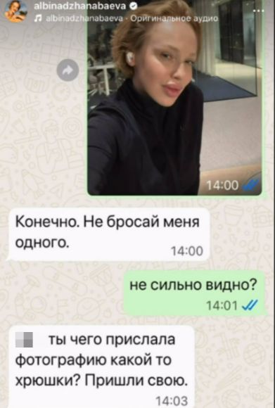 «Ты чего прислала мне фото какой‑то хрюшки. <…> Так быстро филлеры вставили и губки надули. Не приходи домой. Это не ты. На днях сын Лука плакал, теперь я плачу. Ты прибавила себе лет 10», — так Меладзе отреагировал якобы на новое лицо любимой жены.